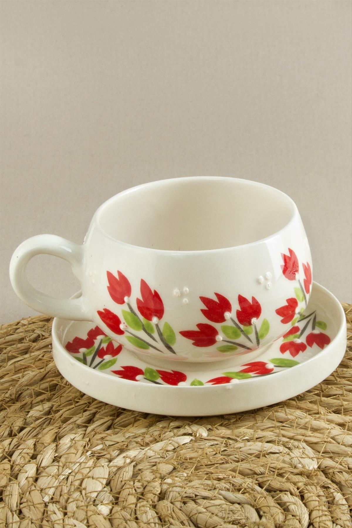 Çiçek Desenli Seramik Tabaklı Kupa