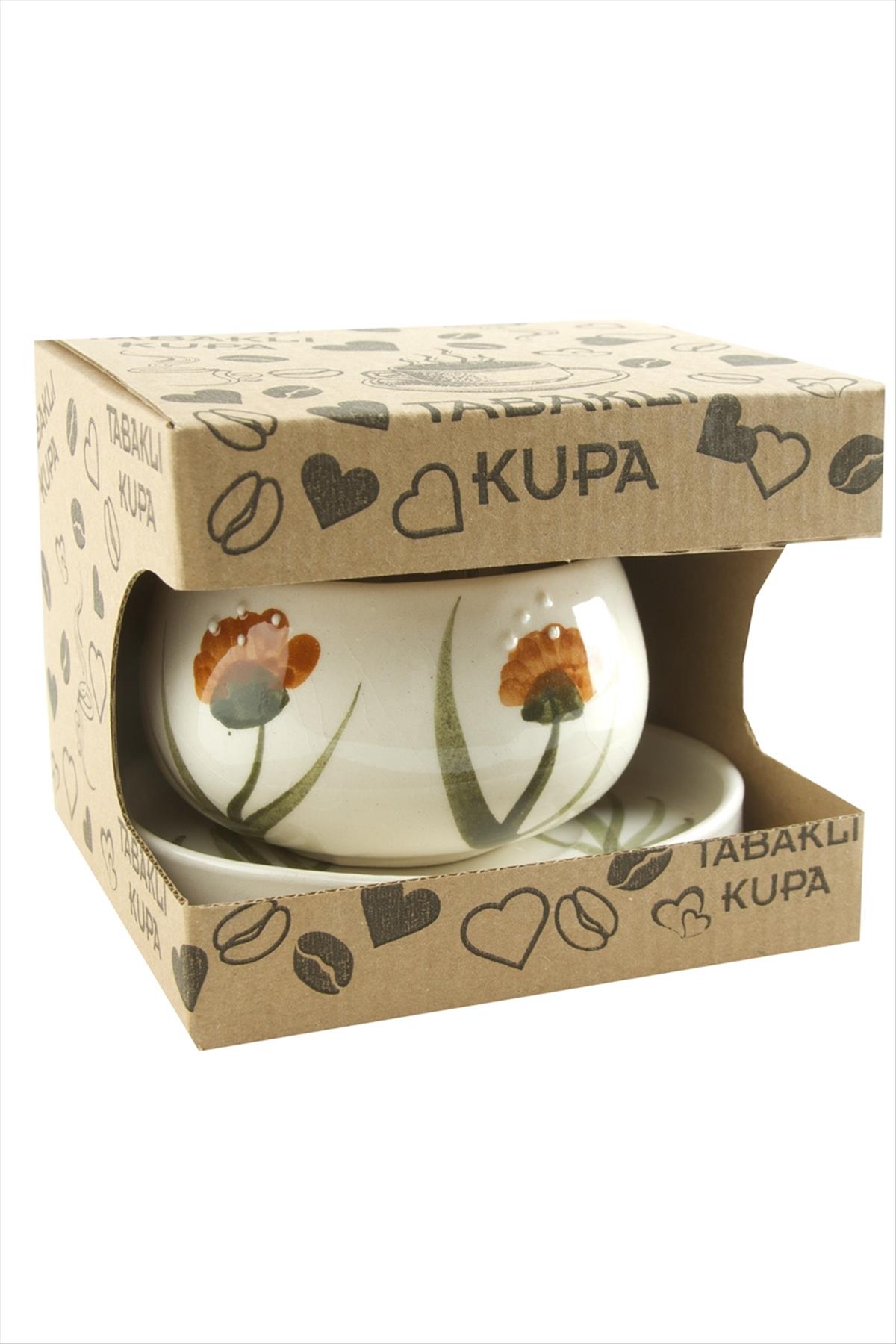 Tabaklı Kupa; Ürün malzemesi seramiktir. Üzerindeki desenler elle çizilip fırınlanmıştır. İçecekleri uzun sür sıcak tutar ve darbelere karşı dayanıklıdır. Ürün kutu içinde tabak ve kupasıyla beraber gönderilecektir. Ürün boyu kupa çapı 8,5 cm ve tabak boyu 12 cmdir.