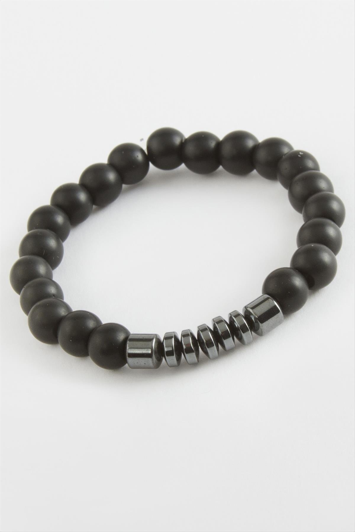 Bileklik: Ürün malzemesi onix ve hematit doğaltaşından imal edilmiştir. Misina üzerine dizilmiştir. misina esneme özelliği bulunmaktadır.
