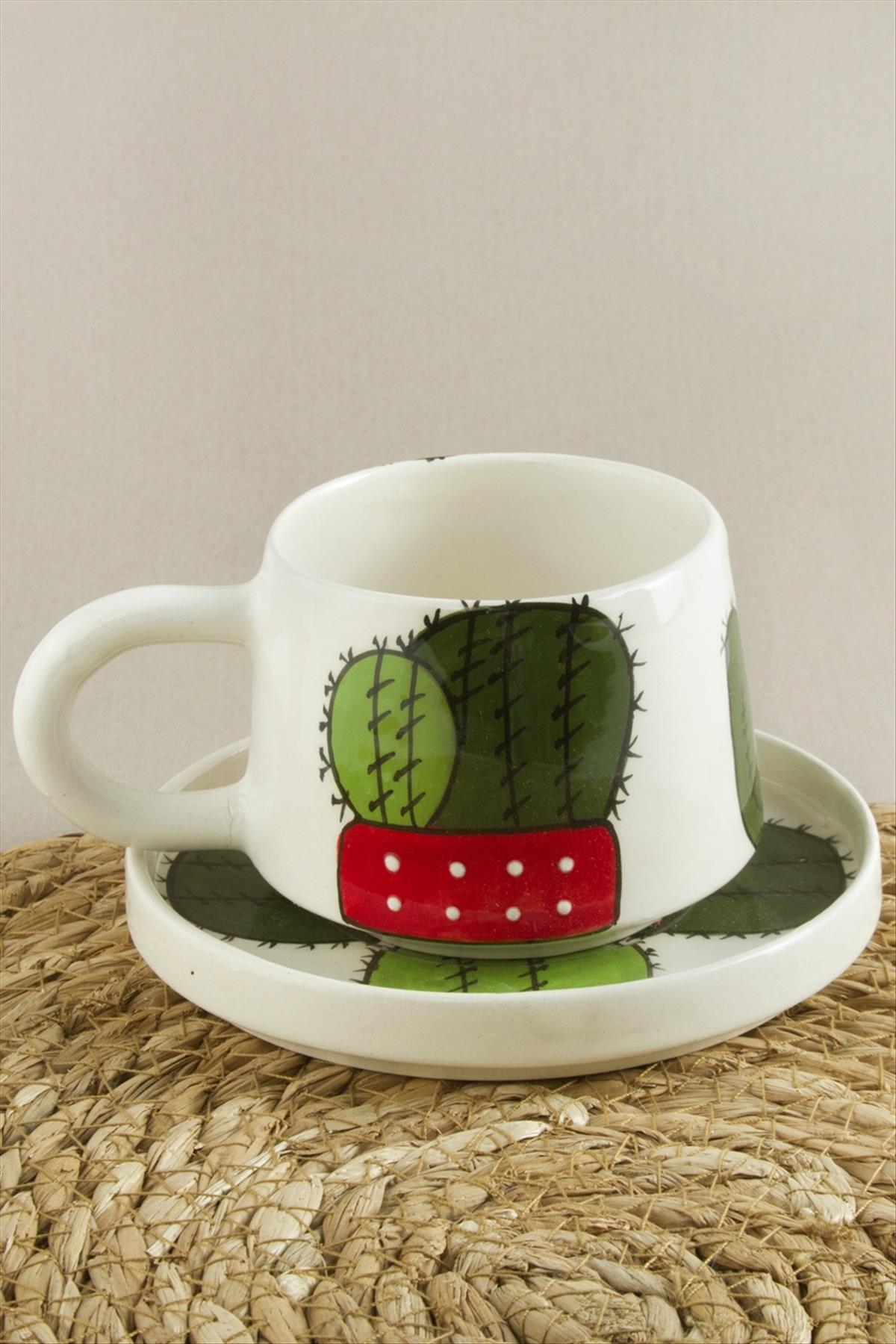 Kaktüs Desenli Seramik Tabaklı Kupa