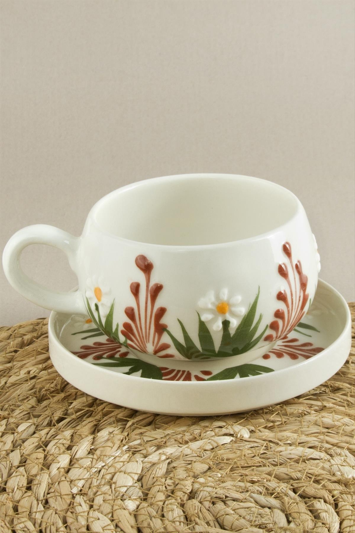 Tabaklı Kupa; Ürün malzemesi seramiktir. Üzerindeki desenler elle çizilip fırınlanmıştır. İçecekleri uzun sür sıcak tutar ve darbelere karşı dayanıklıdır. Ürün kutu içinde tabak ve kupasıyla beraber gönderilecektir. Ürün boyu kupa çapı 8,5 cm ve tabak boyu 12 cmdir.