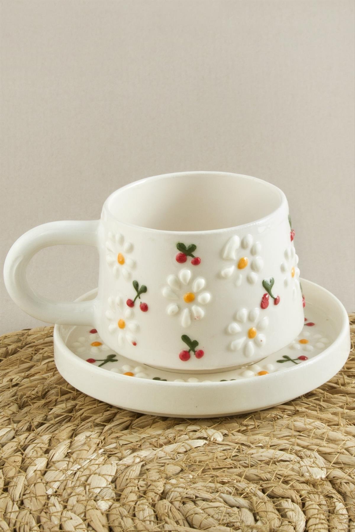 Papatya Kiraz Desenli Seramik Tabaklı Kupa