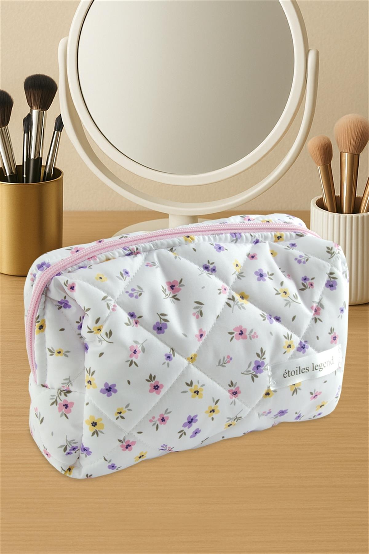 Makyaj Çantası; Ürün malzemesi elyaflı kapitoneli astar kumaştır. Ürün boyu 10*21 cm ve yüksekliği 12 cmdir. 30 derecede yıkanabilir. Su geçirmez. Fermuarlıdır.