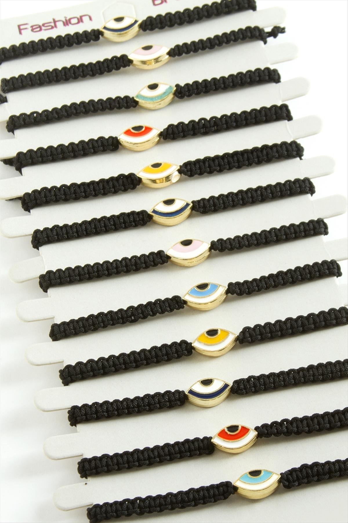 Bileklik; Ürün malzemesi mine boyama ve makrome iptir. Ürün arkası asansörlüdür. Bileğe göre ayarlanabilir. Aparat boyu 1 cmdir. Kartlıdır. Ürün göz renkleri asortilidir. Siparişlerinizde karışık olarak gönderilecektir.