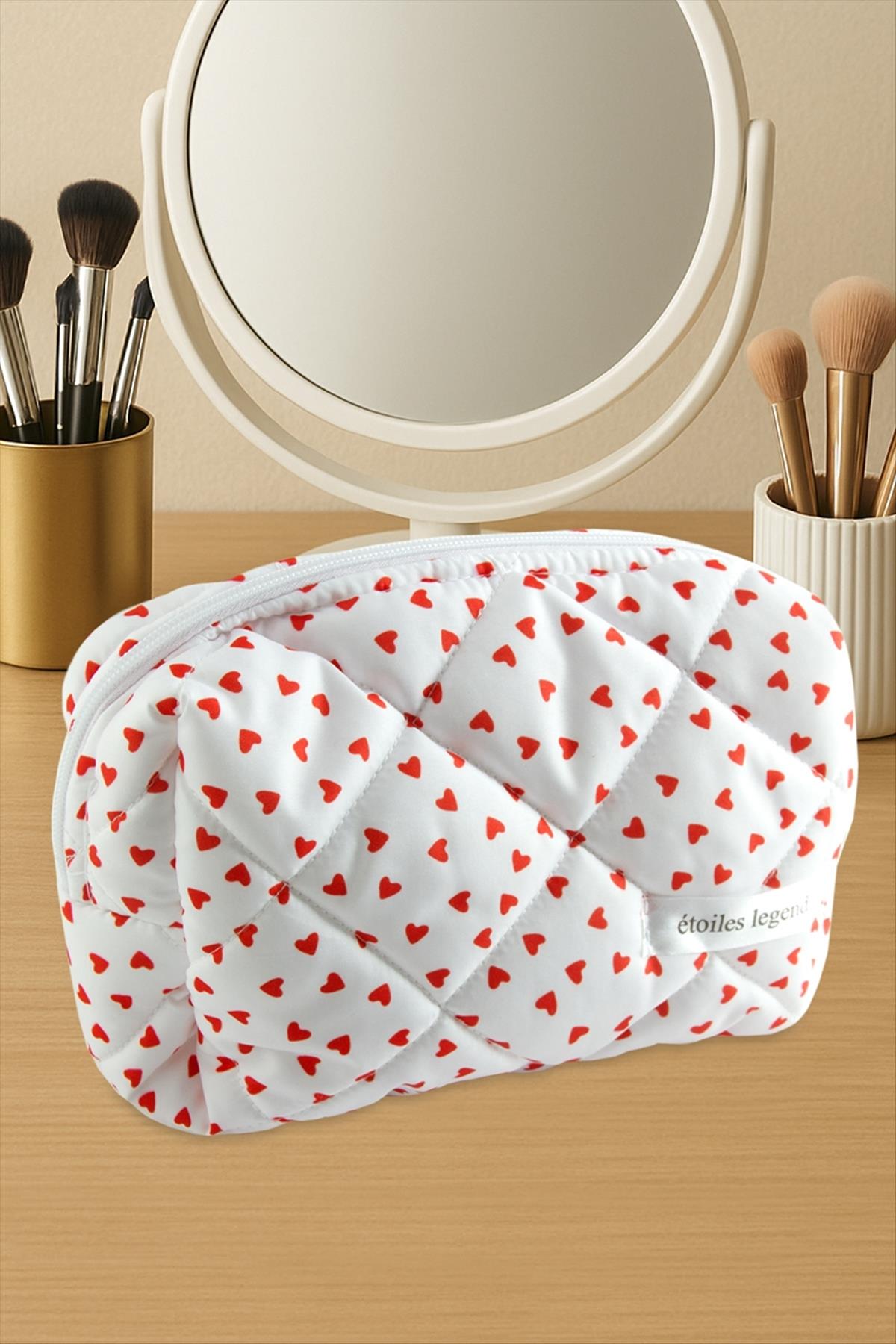 Makyaj Çantası; Ürün malzemesi elyaflı kapitoneli astar kumaştır. Ürün boyu 10*21 cm ve yüksekliği 12 cmdir. 30 derecede yıkanabilir. Su geçirmez. Fermuarlıdır.