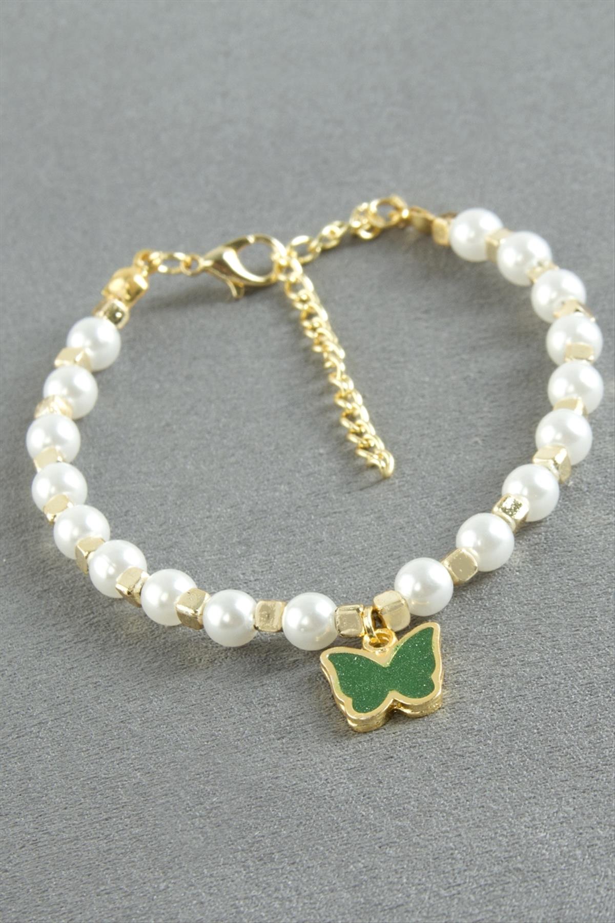 Bileklik; Ürün malzemesi inci, mine boyama ve metaldir. Kartlıdır. Boyu 19 cmdir.