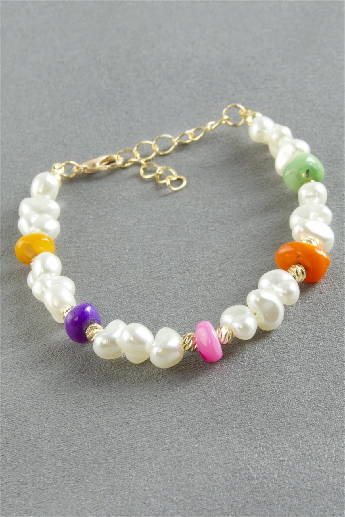 Bileklik; Ürün malzemesi kırık doğaltaş ve incidir. Ürün boyu 19 cmdir. Fiyat 1 adet için geçerlidir. Kartlıdır.