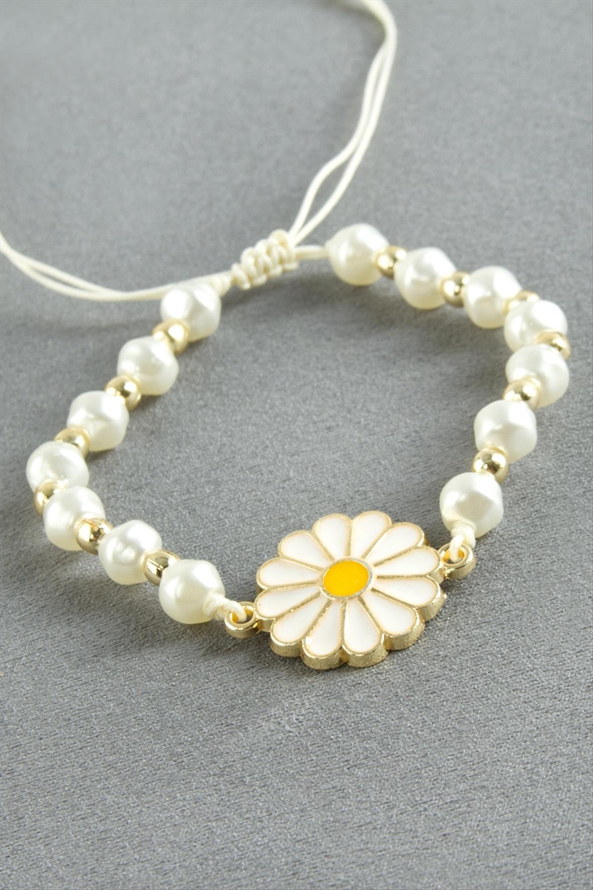 Bileklik; Ürün malzemesi inci ve makrome iptir. Ürün arkası asansörlüdür. Bileğe göre ayarlanabilir.