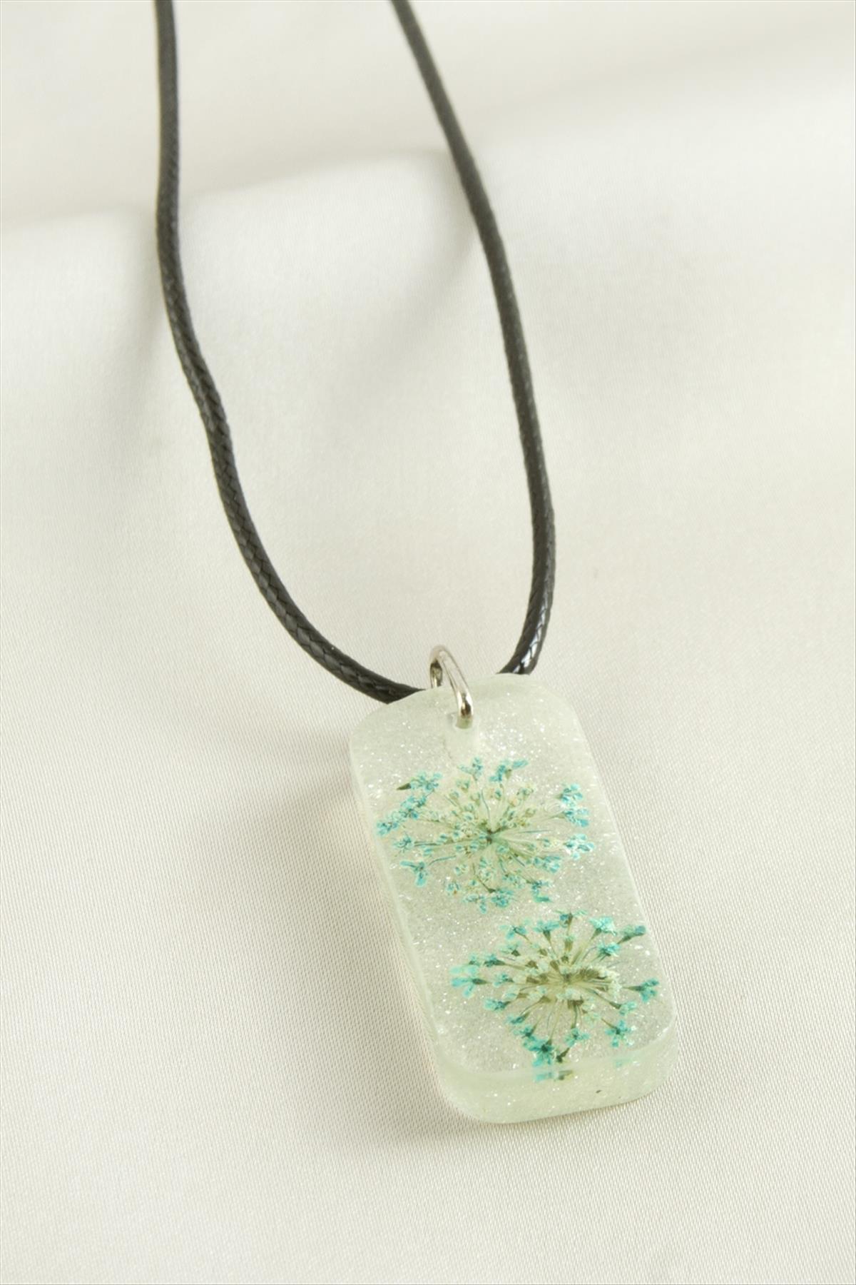 Epoksi Kolye; Ürün malzemesi deri ve epoksi malzemeden üretilmiştir. Ürün 1 sınıf kristal epoksi malzeme kullanılmıştır. Kolye deri ip uzunluğu 50 cm ve ucundaki epoksi 3,5 cmdir.