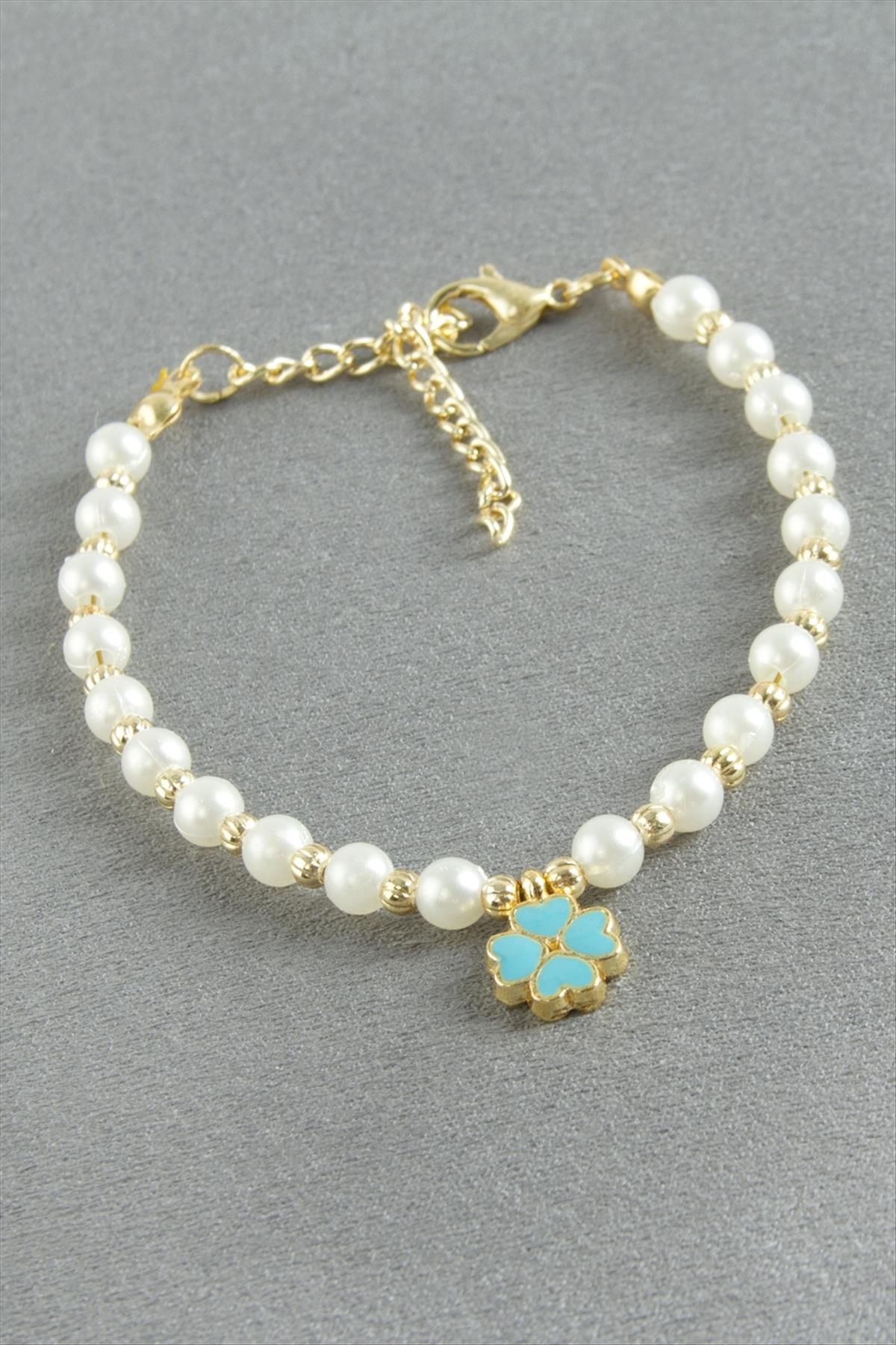 Bileklik; Ürün malzemesi inci, mine boyama ve metaldir. Kartlıdır. Boyu 19 cmdir.